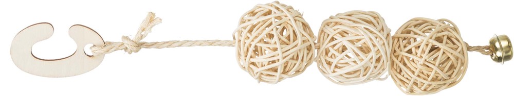 Ett enkelt men stimulerande leksak som väcker fågelns nyfikenhet och leklust. De flätade rattanbollarna ger en spännande struktur att picka och utforska, medan den lilla bjällran bidrar med extra stimulans.