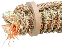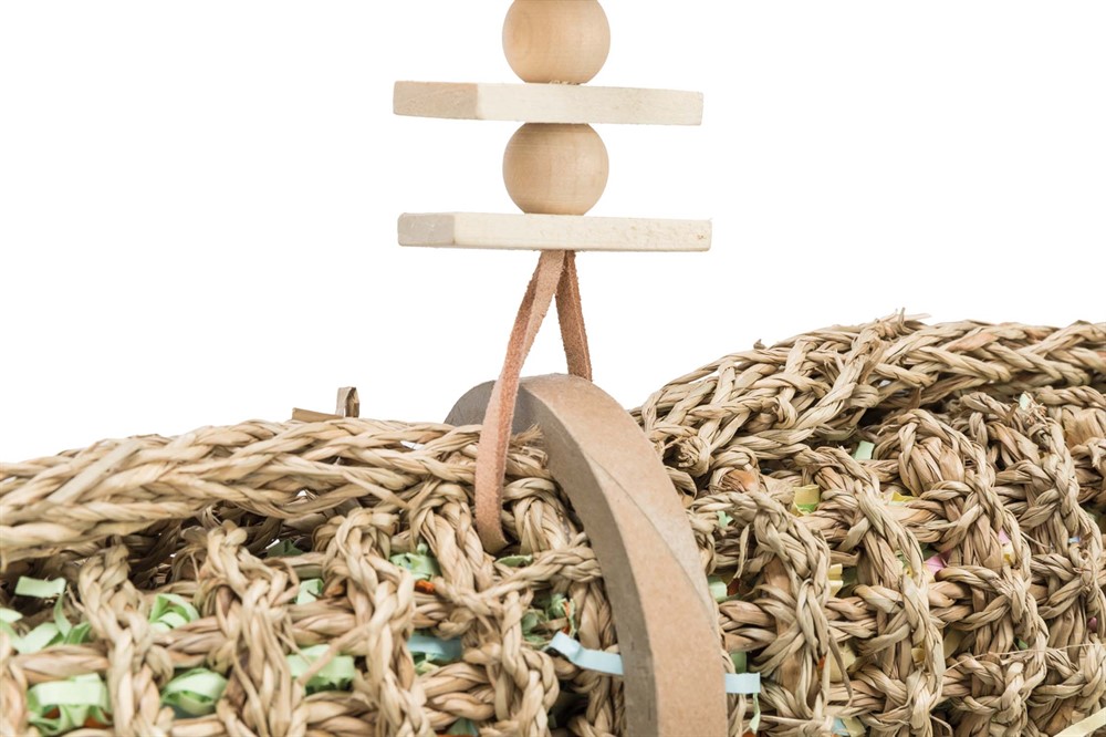 Ett varierat fågelleksak som kombinerar olika material och strukturer för att väcka nyfikenhet och stimulera lek. Perfekt för fåglar som gillar att plocka, dra och utforska.