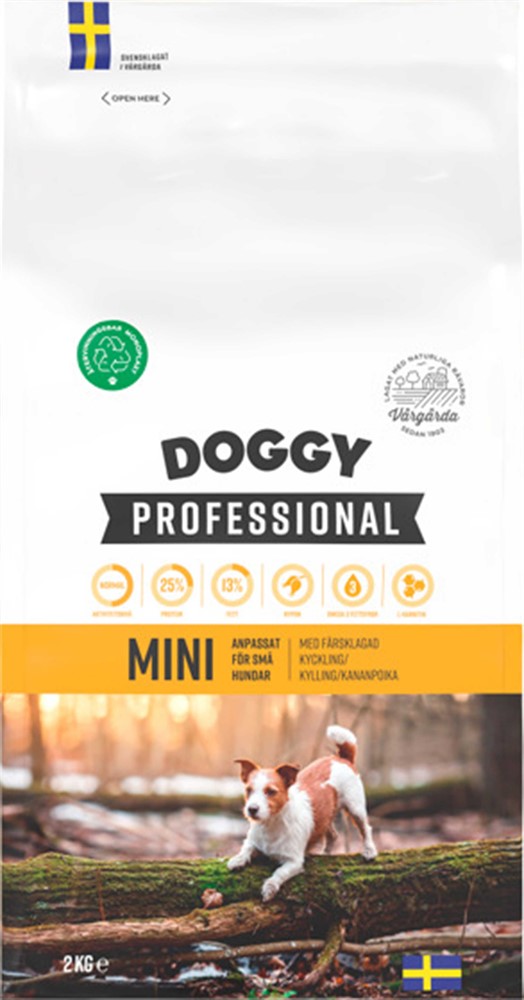 Doggy Professional Mini är ett helfoder särskilt utvecklat för små hundar med högt energibehov. Det har en högre halt av protein och fett samt mindre bitstorlek – perfekt för små munnar. Fodret tillagas i Vårgårda med naturliga råvaror, som färsk svensk kyckling, nypon rika på vitamin C, Omega-3 från fiskolja och L-karnitin. Berikat med vitaminer och mineraler för att främja din hunds hälsa. Servera torrt eller blötlagt i ljummet/kallt vatten.