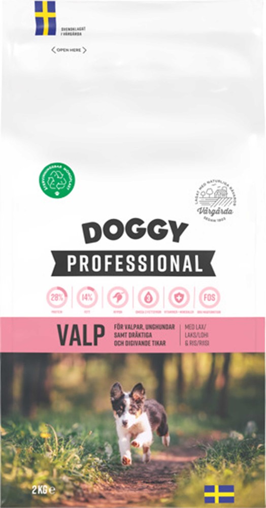 Doggy Professional Valp är ett helfoder speciellt framtaget för valpar och unga hundars behov, och passar även dräktiga och digivande tikar. Fodret innehåller färsklagad lax, rik på omega-3-fettsyror som stödjer valpens utveckling, samt nypon, L-karnitin, extra vitaminer och mineraler för en balanserad och näringsrik kost. Prebiotikan FOS bidrar till en hälsosam tarmflora och en välfungerande mage. Tillagas i Vårgårda med naturliga kvalitetsråvaror och kan serveras torrt eller uppblött.