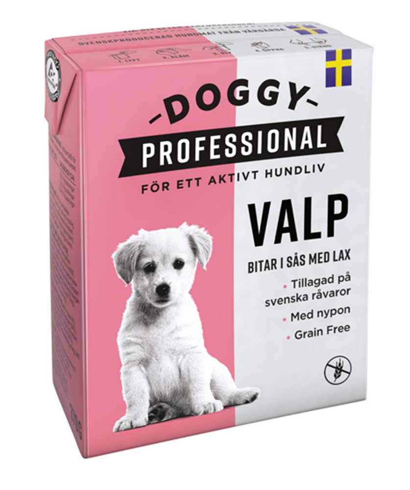 För det blivande proffset har vi tagit fram Doggy Professional Valp, bitar i sås med lax, ett våtfodret tillagat på svenska råvaror, naturliga ingredienser och utan onödiga tillsatser.