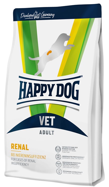 Happy Dog VET Diet Renal används för att minska belastningen på njurarna vid akut och kronisk njurinsufficiens. De viktigaste egenskaperna hos denna diet är nivåerna av lättsmält protein, fosfor och natrium som är särskilt anpassade till dessa behov. Det mycket välsmakande receptet med proteinkällorna köttmjöl, lax och ägg uppmuntrar till matkonsumtion och säkerställer upptag av näringsämnen. Innehåller örterna – björkblad och maskros – som traditionellt används för att rena blodet och stödja njurarna.