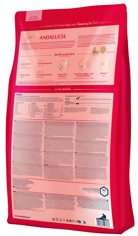 Happy Dog Andalucía är perfekt för alla krävande, vuxna finsmakare från 11 kg som letar efter variation eller är väldigt kräsna.