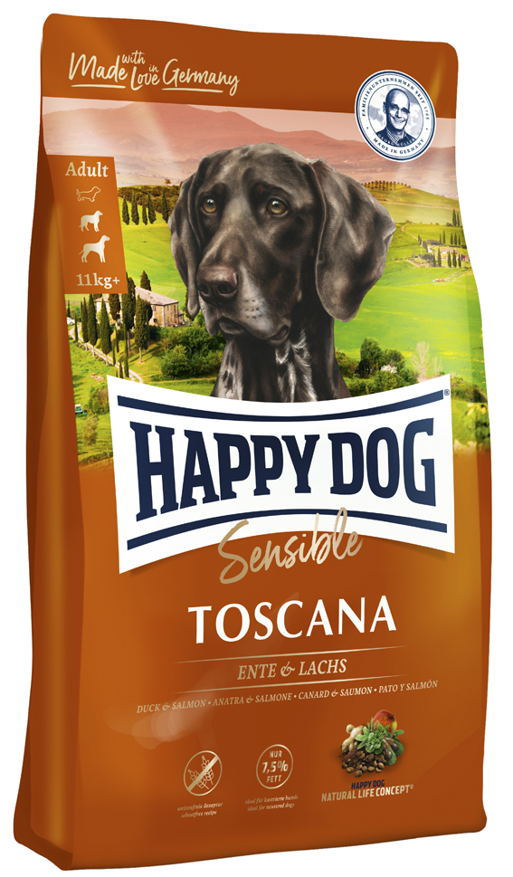 Medelhavsköket har alltid varit känt för sina goda och lätta rätter. Med Happy Dog Toscana skämmer du bort din vovve med en balanserad sammansättning av fin anka, havsfisk med låg fetthalt och medelhavsörter. Det exklusiva receptet baserat på det unika Happy Dog Natural Life Concept® förädlas med värdefulla nyzeeländska musslor för lederna. Tack vare de speciella ingredienserna och den särskilda tillverkningsmetoden är Sensible Toscana mycket lämpligt som medveten kost speciellt för känsliga hundar med deras särskilda behov.