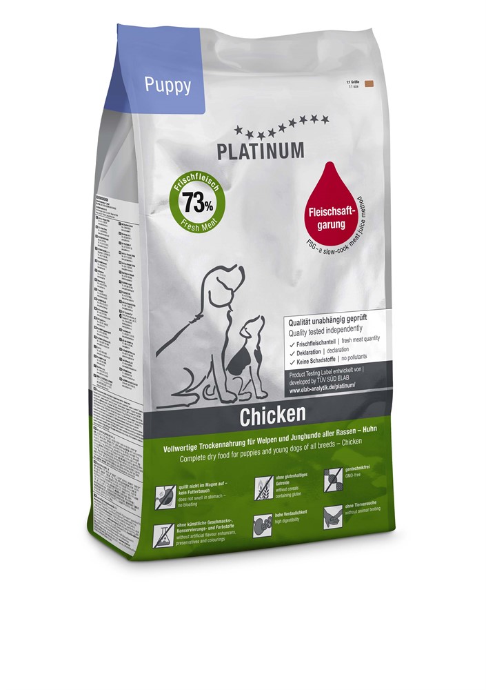 Puppy Chicken är tillagat av 73 % färskt kycklingkött av human kvalitet. Bitar av kyckling tillagas varsamt tillsammans med ris i sin egen köttsaft; inget vatten tillsätts till processen. Sedan torkas fodret skonsamt. Vitaminer, fetter och oljor tillsätts vid rumstemperatur, vilket garanterar deras naturliga tillstånd och behåller därför sitt fulla näringsvärde.