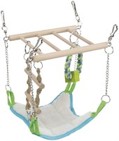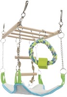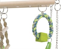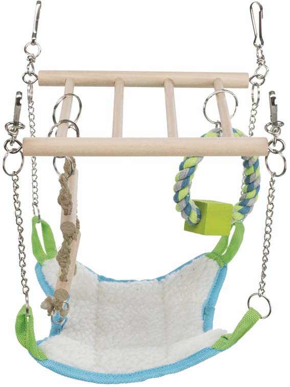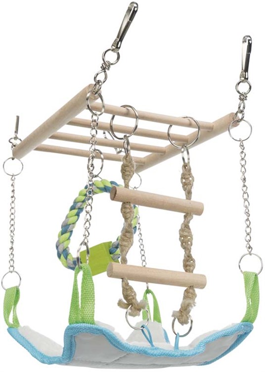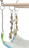 trästege med hammock med nylon-/lammimitation (polyester), repstege och repring med träblock.